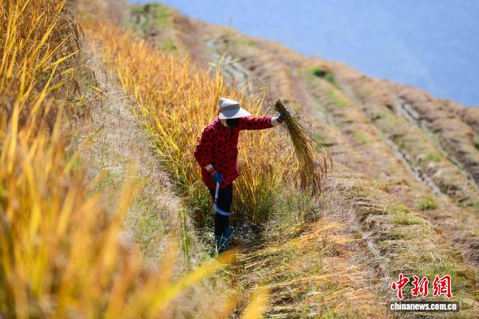10月28日,村平易近正在支割火稻。潘志祥 摄